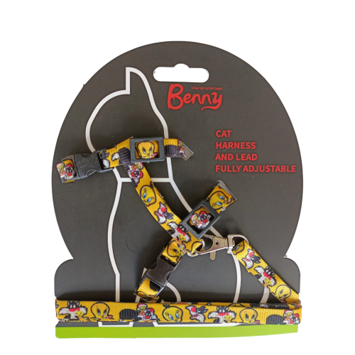 Üzerinde civciv desenleri mevcut kedi göğüs tasması ve gezdirme kayışından oluşat gezdirme setidir.