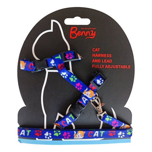 Üzerinde mavi şerit üzerine pati desenleri mevcut kedi göğüs tasması ve gezdirme kayışından oluşat gezdirme setidir.
